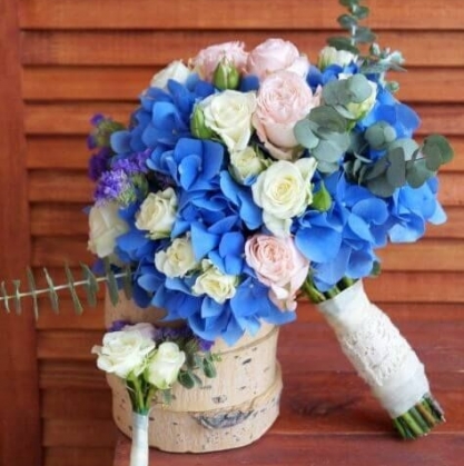 Яркий букет невесты из гортензии, кустовых и садовых роз с добавлением статицы и эвкалипта. Бутоньерка и пакет лепестков в подарок!