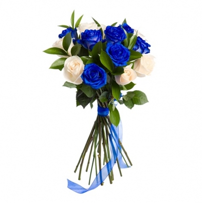 Сочетание синих и белых роз с добавлением рускуса. Количество роз в букете можно изменять.