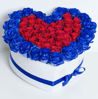 Коробка из синих и красных роз сердцем