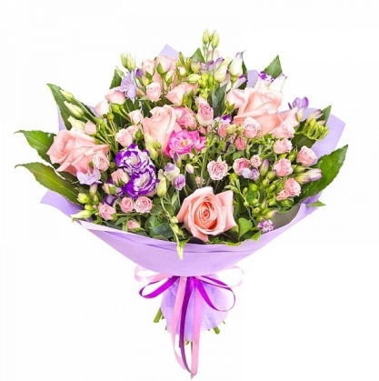 Композиция из кустовых роз, фрезии и эустомы