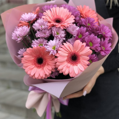 Красивый и роскошный букет, состоящий из гербер, хризантемы и упаковки. Розовые герберы имеют мягкий, нежный цвет и изящные формы, которые добавляют женственности и романтики к букету. Сиреневая хризантема имеет красивый цвет, который идеально дополняет розовые герберы, добавляя глубины и интереса к букету. В целом, этот букет будет идеальным выбором для девушки, маме или другу в день рождения, день святого Валентина или другой специальный праздник.
