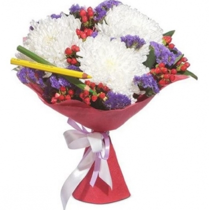 Букет из хризантем, статицы и гиперикума, декорированный карандашами