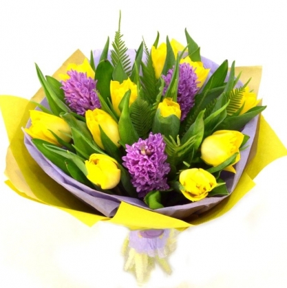 Весенний букет из тюльпанов и гиацинтов в двойной упаковке